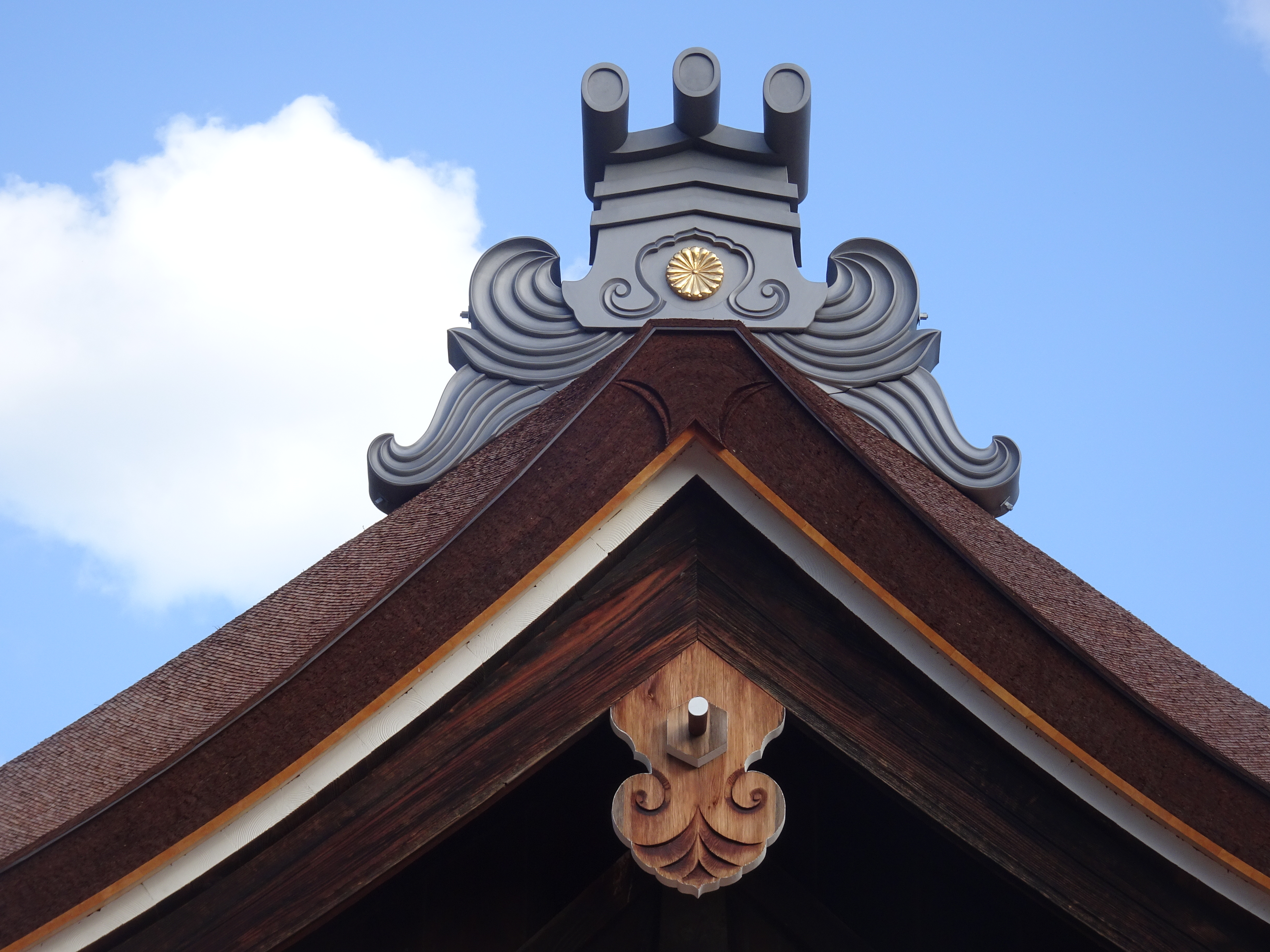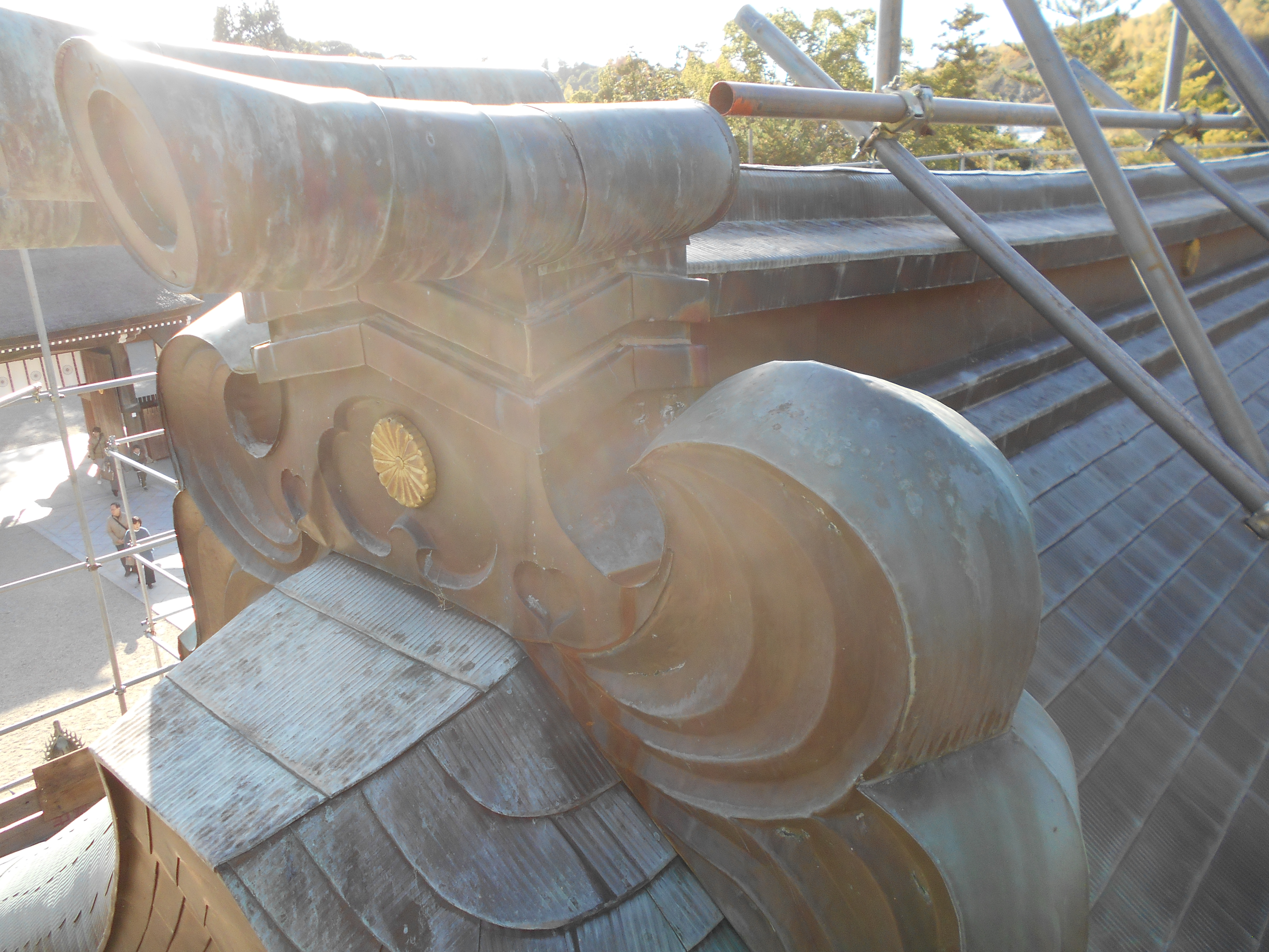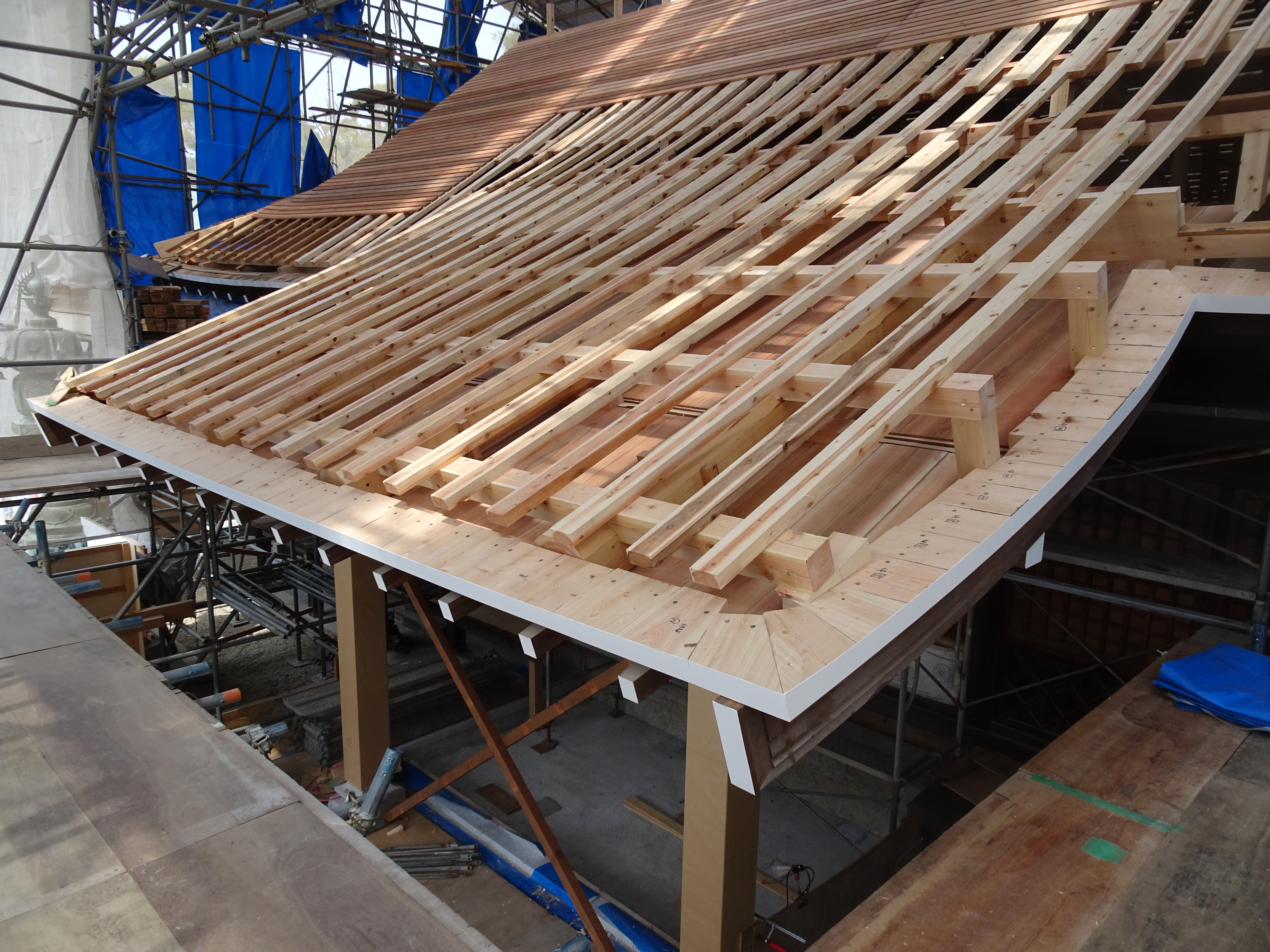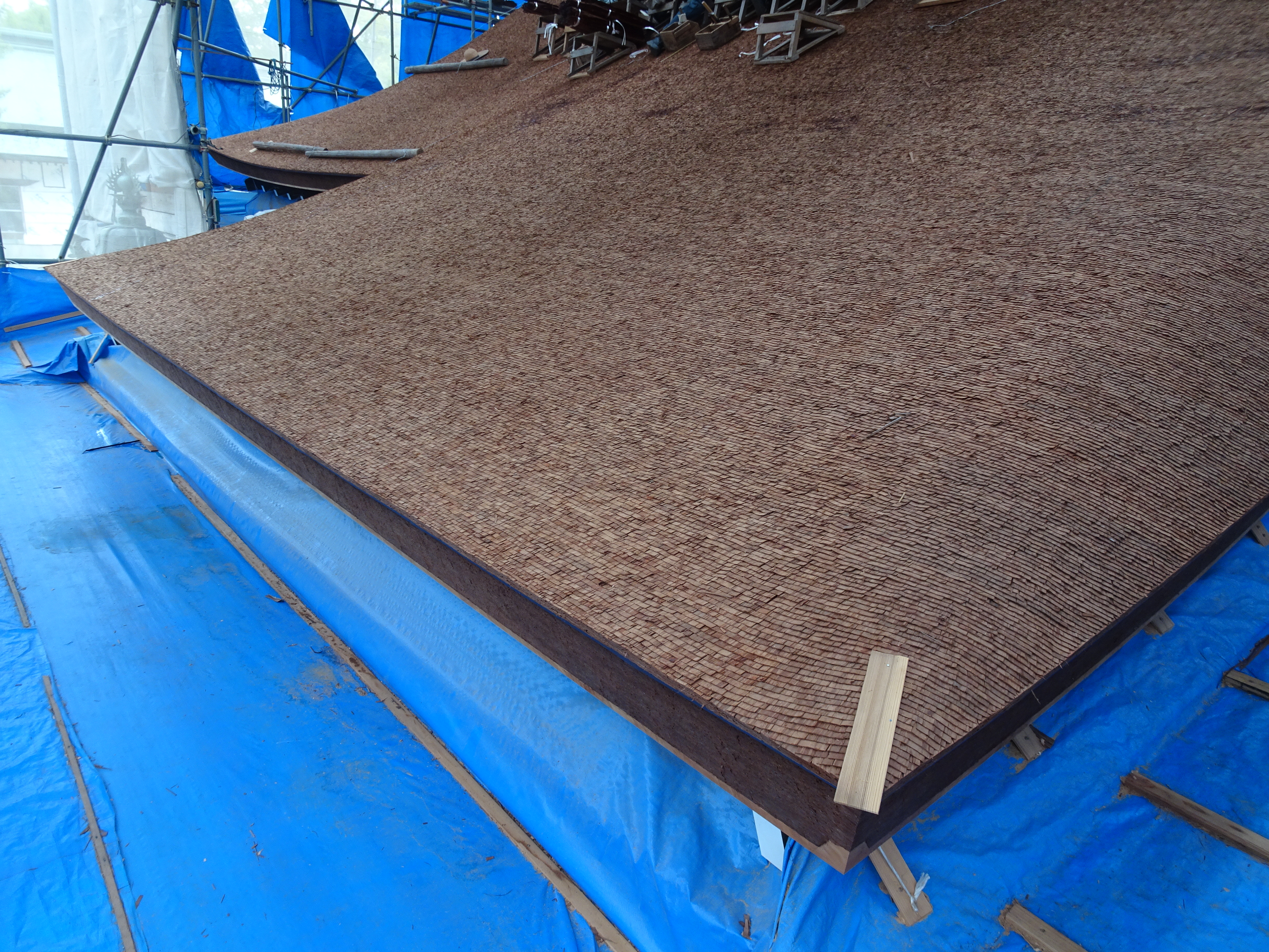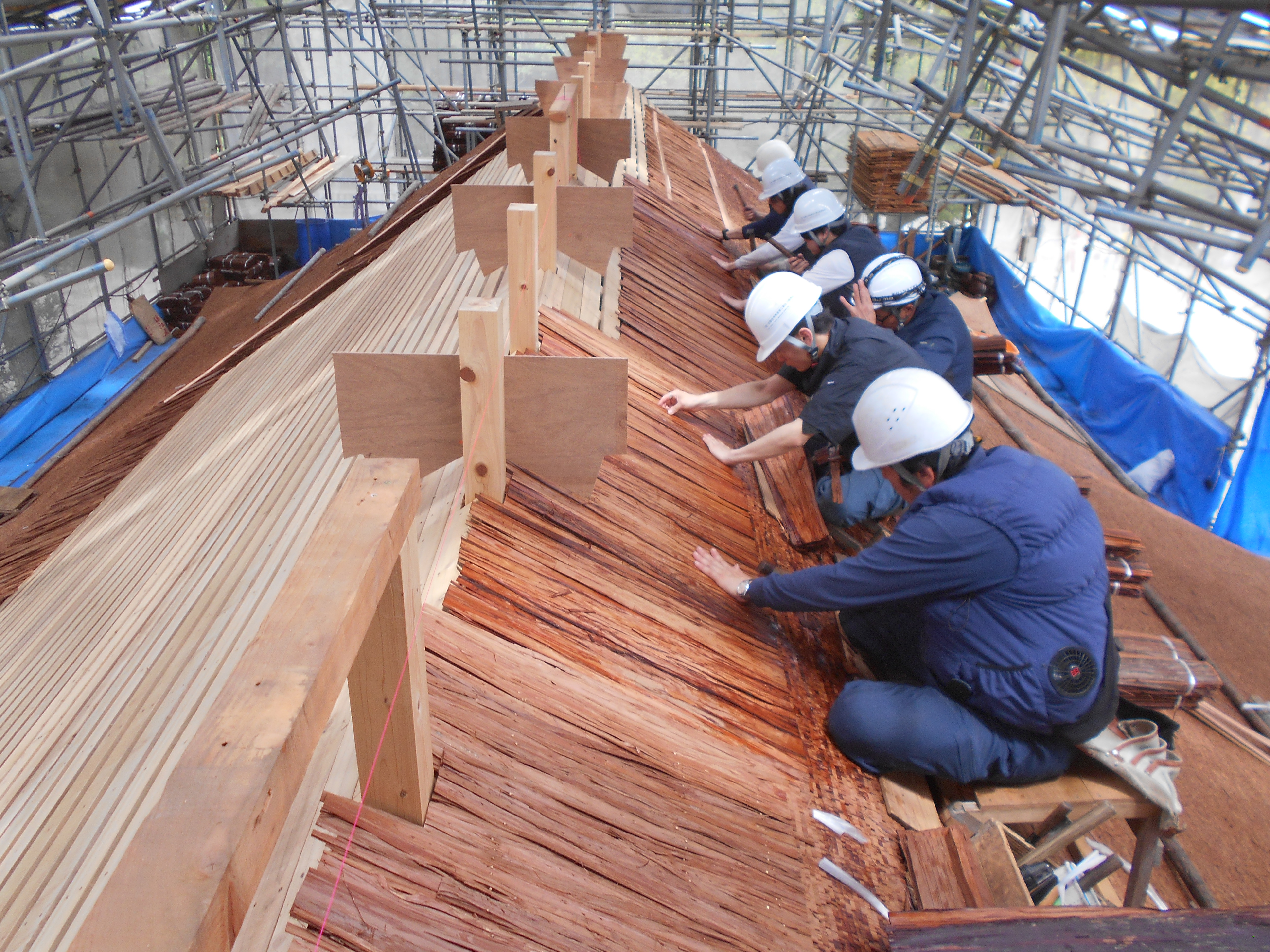 明治に再建された建物で当初は檜皮葺きの屋根で葺かれていましたが、その後一文字の銅板葺き屋根が葺かれ現在に至っておりました。本殿・幣殿・中門の檜皮葺き葺替え工事の後、令和6年秋より拝殿檜皮葺き及び向拝増設工事の計画がスタートしました。銅板葺きから檜皮葺きに復元することが弊社でも初めてで宮司様はじめ施工関係者と綿密な打ち合わせを重ねました。棟も本殿と同じく淡路瓦で据えられ、当初の形をよみがえらせることができました。