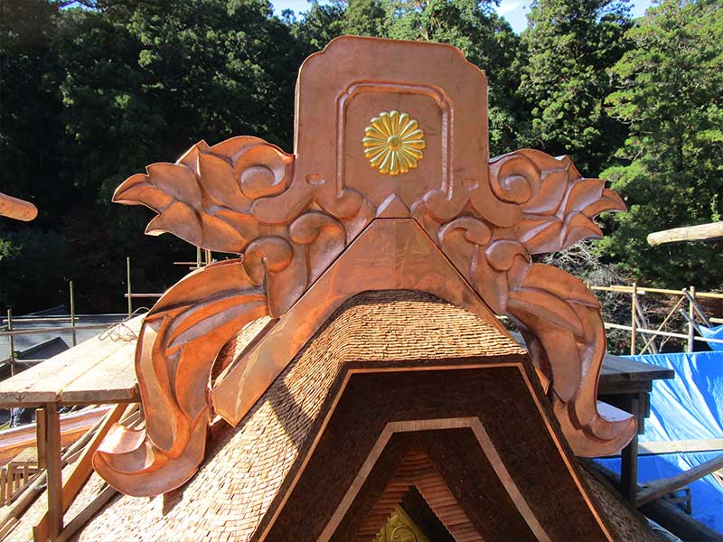 小國神社本殿の檜皮葺き屋根は、長年の風雨により経年劣化が進み、雨漏りの危険が高まっていました。そこで、室内への影響を防ぐため、檜皮葺きの全面葺き替え工事をご依頼いただきました。当社は初代から約100年にわたり小國神社とご縁をいただいており、今回も伝統技術を大切にしながら工事を進めました。足場は古来の手法に倣い丸太を用いて組み上げ、神社関係者の皆様から「今でもこのような伝統技術で施工してもらえるのか」と大変喜んでいただきました。ドローンによる足場の写真も掲示し、工事の様子を広くご覧いただきました。また、屋根材には神社様が所有する山から採取した檜皮を使用したいとのご要望があり、1年前から素材の準備を始め、施工まで一貫して計画した特別なプロジェクトとなりました。伝統と信頼、そして地域の自然を活かした工事を実現できたことを誇りに思います。