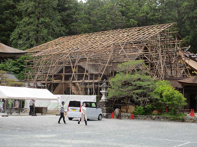 小國神社本殿の檜皮葺き屋根は、長年の風雨により経年劣化が進み、雨漏りの危険が高まっていました。そこで、室内への影響を防ぐため、檜皮葺きの全面葺き替え工事をご依頼いただきました。当社は初代から約100年にわたり小國神社とご縁をいただいており、今回も伝統技術を大切にしながら工事を進めました。足場は古来の手法に倣い丸太を用いて組み上げ、神社関係者の皆様から「今でもこのような伝統技術で施工してもらえるのか」と大変喜んでいただきました。ドローンによる足場の写真も掲示し、工事の様子を広くご覧いただきました。また、屋根材には神社様が所有する山から採取した檜皮を使用したいとのご要望があり、1年前から素材の準備を始め、施工まで一貫して計画した特別なプロジェクトとなりました。伝統と信頼、そして地域の自然を活かした工事を実現できたことを誇りに思います。